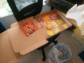 Then it was time to slice up the fabric (this batik star didn't make the end quilt, but I did play with it in my piecing at one point). Clean pizza boxes were great for keeping colours separate. This was 'Africa' with a little of Asia. I cut the fabrics into 2 1/2" squares.